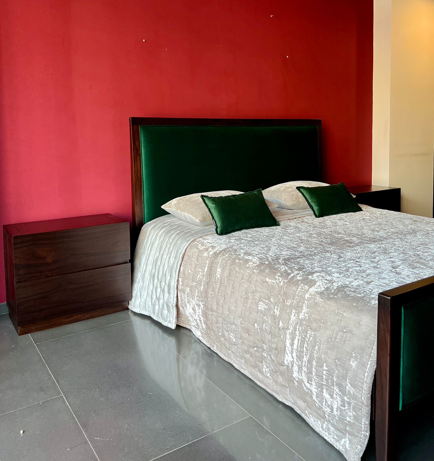 A contemporary bed with a dark brown wood finish and deep emerald green velvet upholstery. Its clean lines and bold contrast create a refined, luxurious centerpiece for any modern bedroom.
