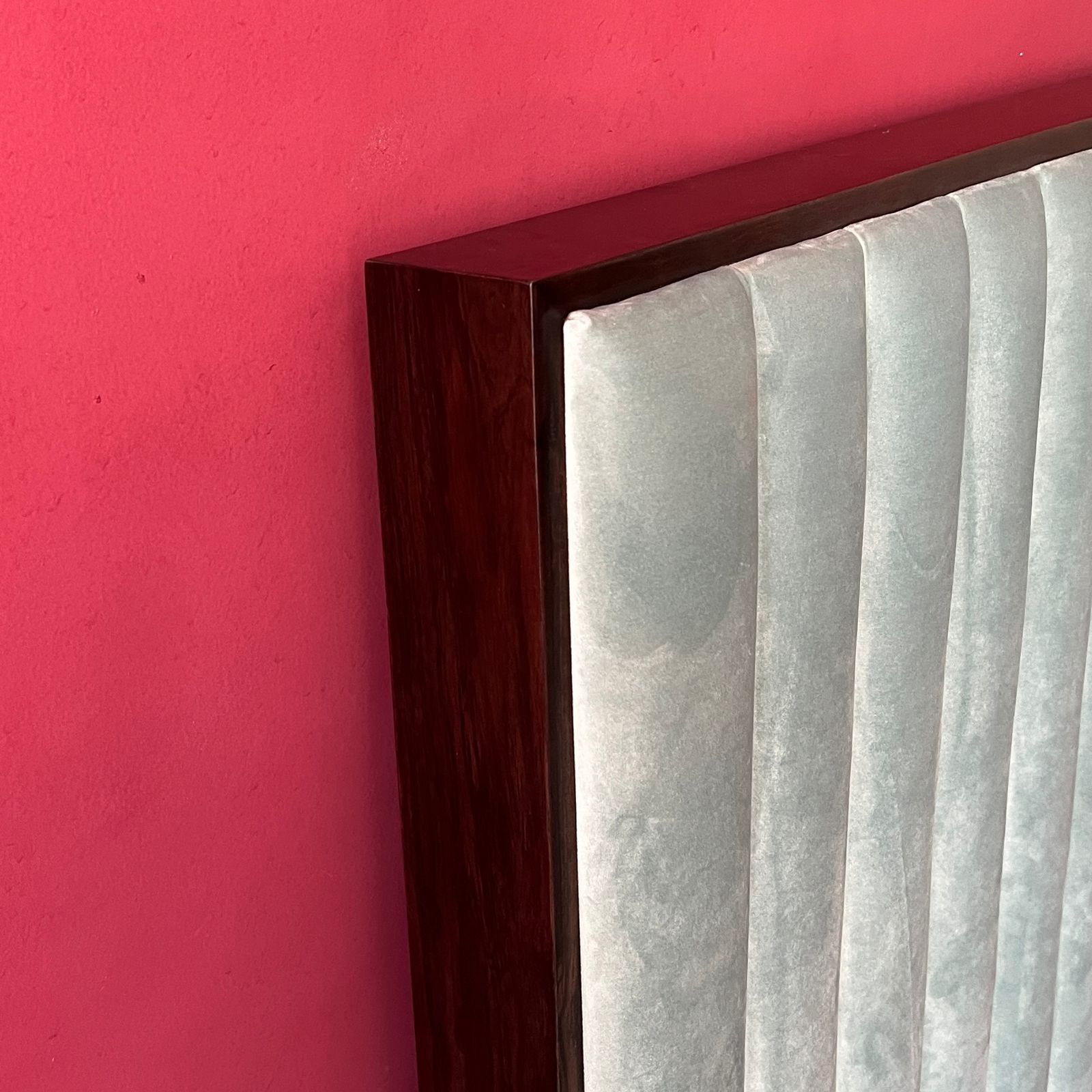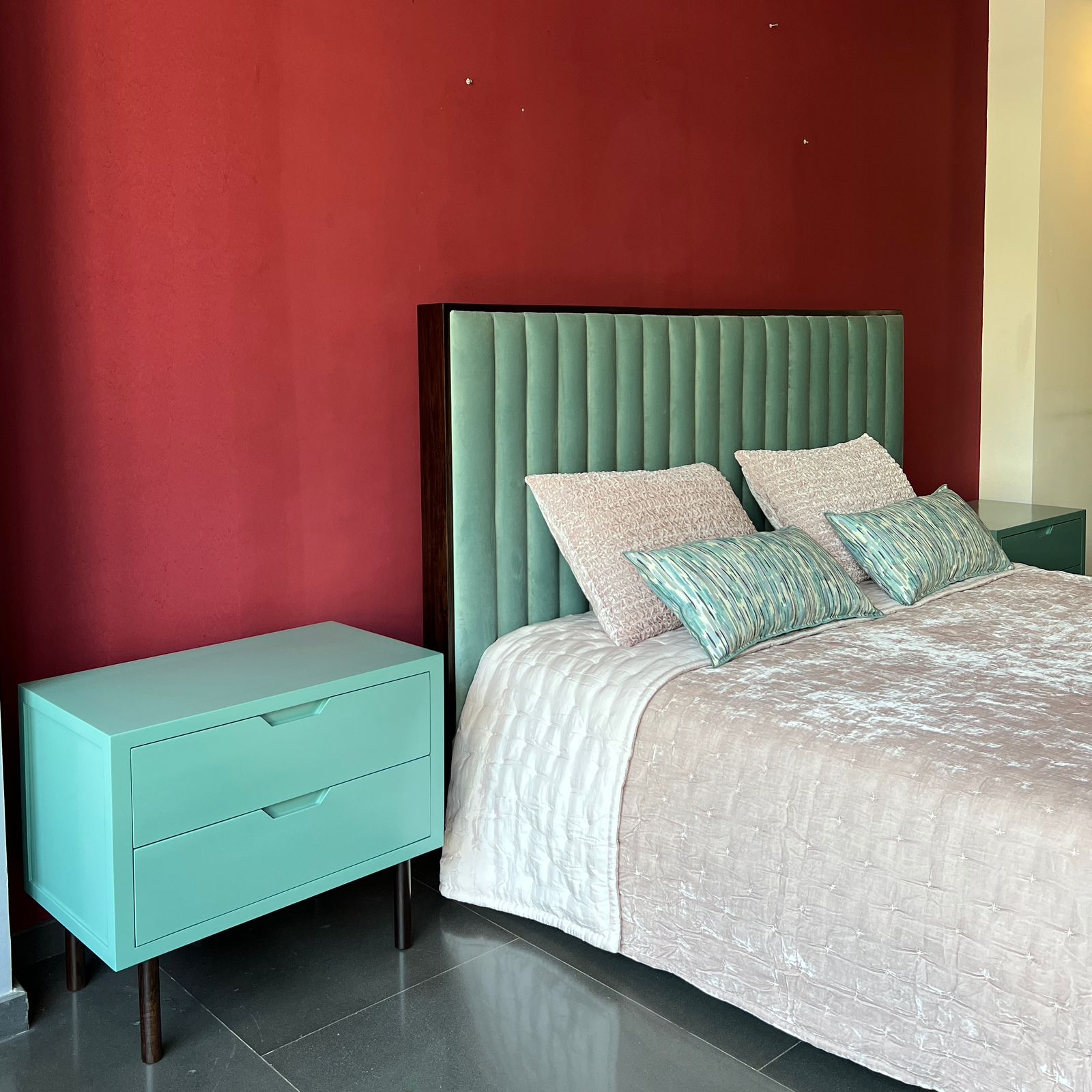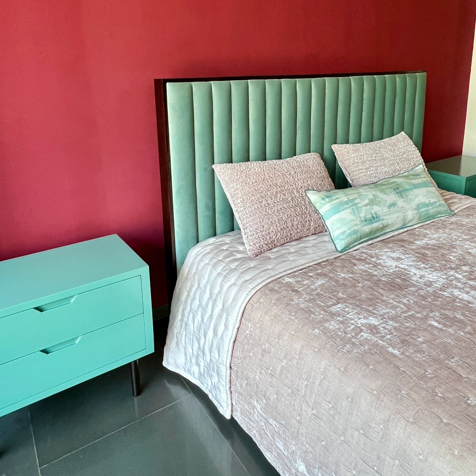 A modern bed featuring a soft mint-green velvet headboard with vertical channels and a slim dark wood frame. Paired with pastel bedding and matching side tables, it brings a fresh, elegant touch to any bedroom.